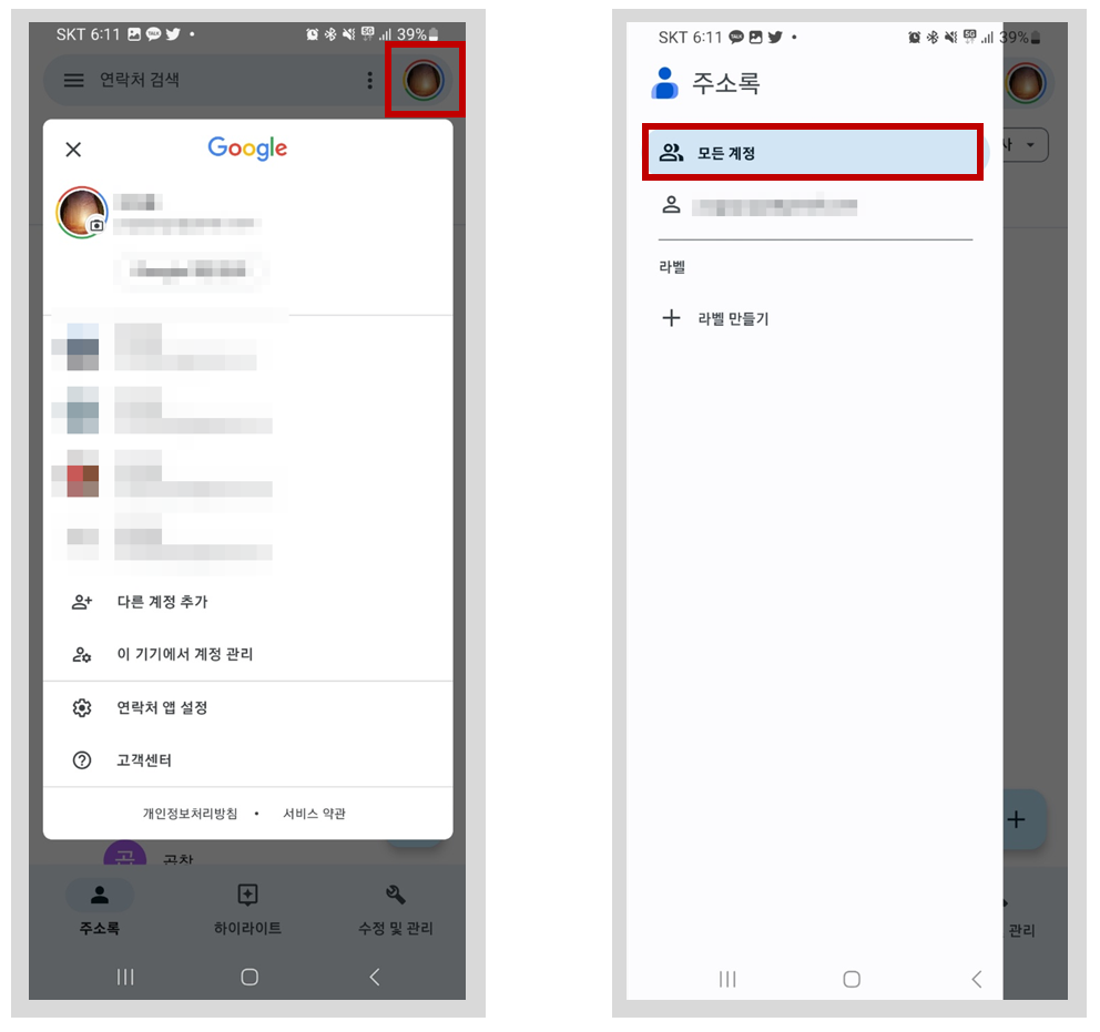 계정을 변경하기 않아도 좌 상단 삼선 아이콘을 클릭해서 모든 계정이 주소록을 확인 할 수 있다.