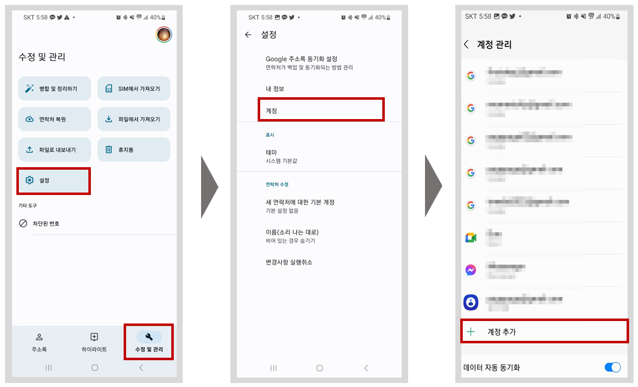 구글 계정 추가하기 :: 구글앱 실행 > 수정 및 관리 > 설정 > 계정 > 계정 추가