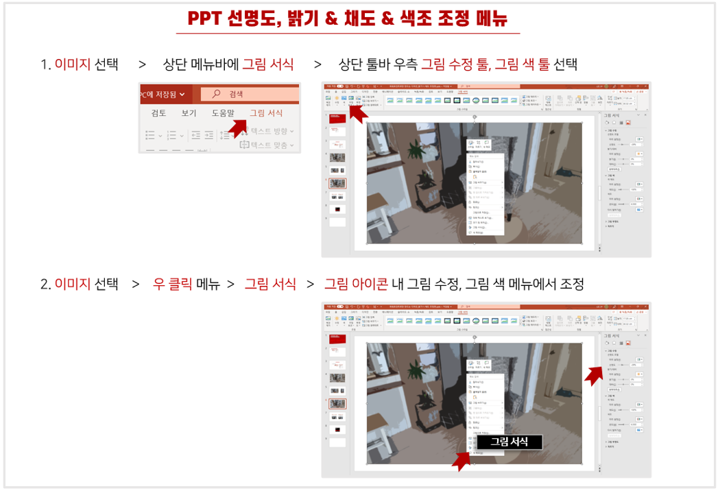 PPT에서 이미지를 수정 할 때는 아주 쉽게 우 클릭 > 그림 서식을 통해 우측에 그림서식 레이어로 접근하기가 가장 용이하다. 그러나 이미지에 대한 이해가 없다면, 수치의 조절로 어떤 이미지가 만들어지는 알기 어렵다. 그래서 어느 정도 이미지에 대한 수정 및 색 보정이 익숙해 질 때 까지는 아래 이미지 1번처럼 그림 서식 > 상단툴바 우측 그림 수정 툴과 그림 색 툴을 통해서 수정한 후, 우측의 그림 서식 레이어를 통해 수치를 조정하는 것을 추천한다